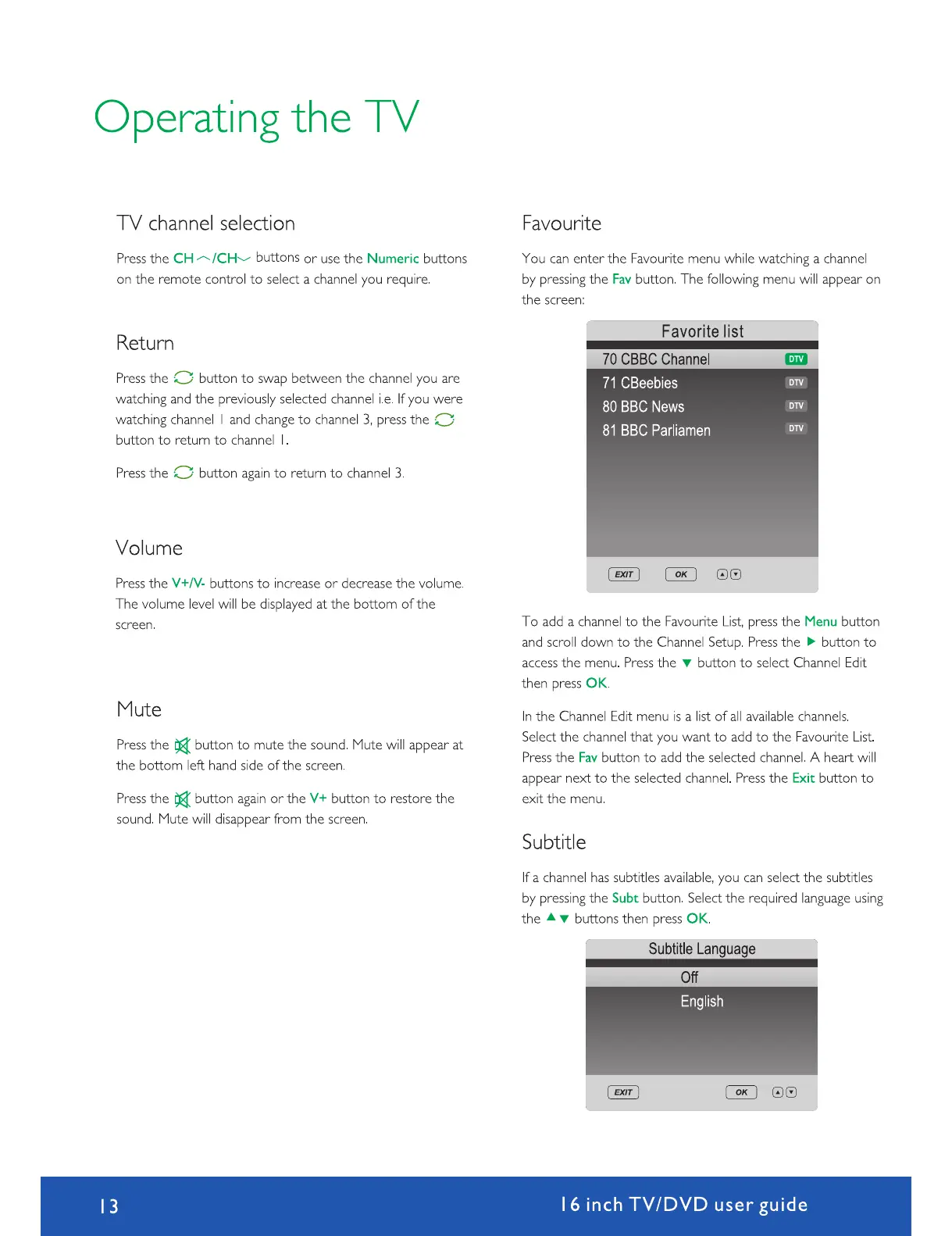 Avtex W164DRS - Operating Your TV: Basic Controls and Favorites; Basic Channel and Volume Control