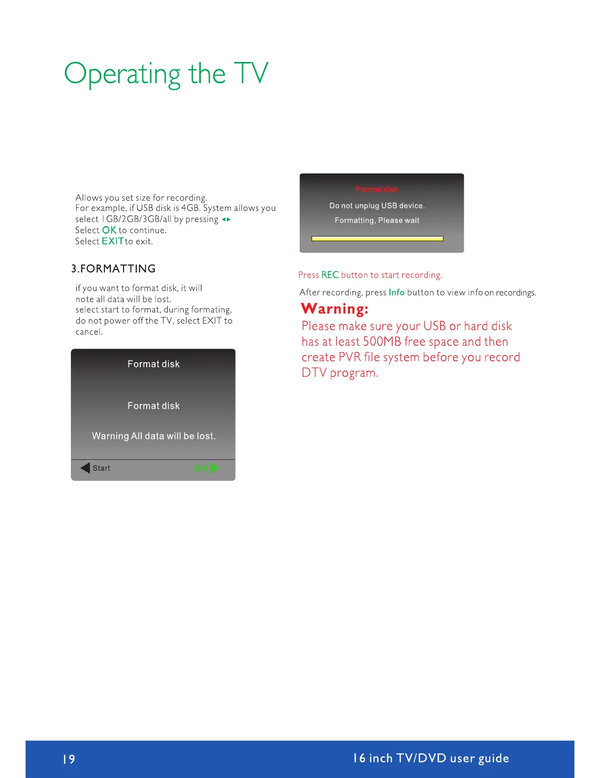 Avtex W164DRS - Operating Your TV: PVR Storage Formatting; PVR Storage Device Formatting