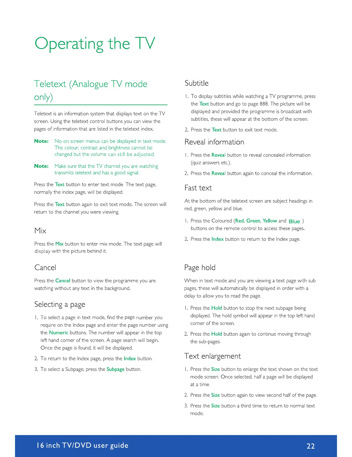 Avtex W164DRS - Operating Your TV: Analogue Teletext; Analogue Teletext Features