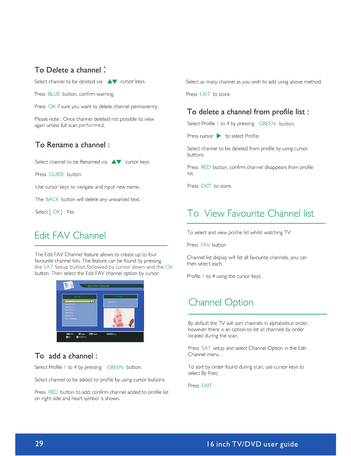 Avtex W164DRS - Favourite Channel List Management; Channel Deletion, Renaming, and Profile Management; Adding and Viewing Favourite Channels