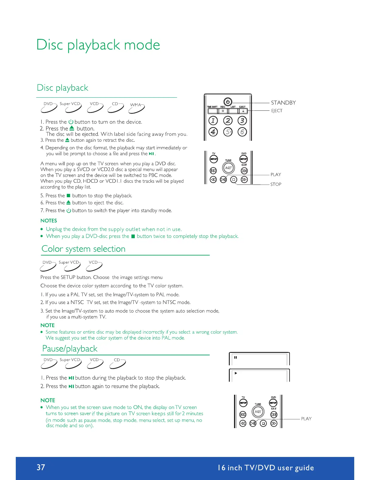 Avtex W164DRS - Disc Playback: Basic Controls and Color Settings; Basic Disc Playback Controls