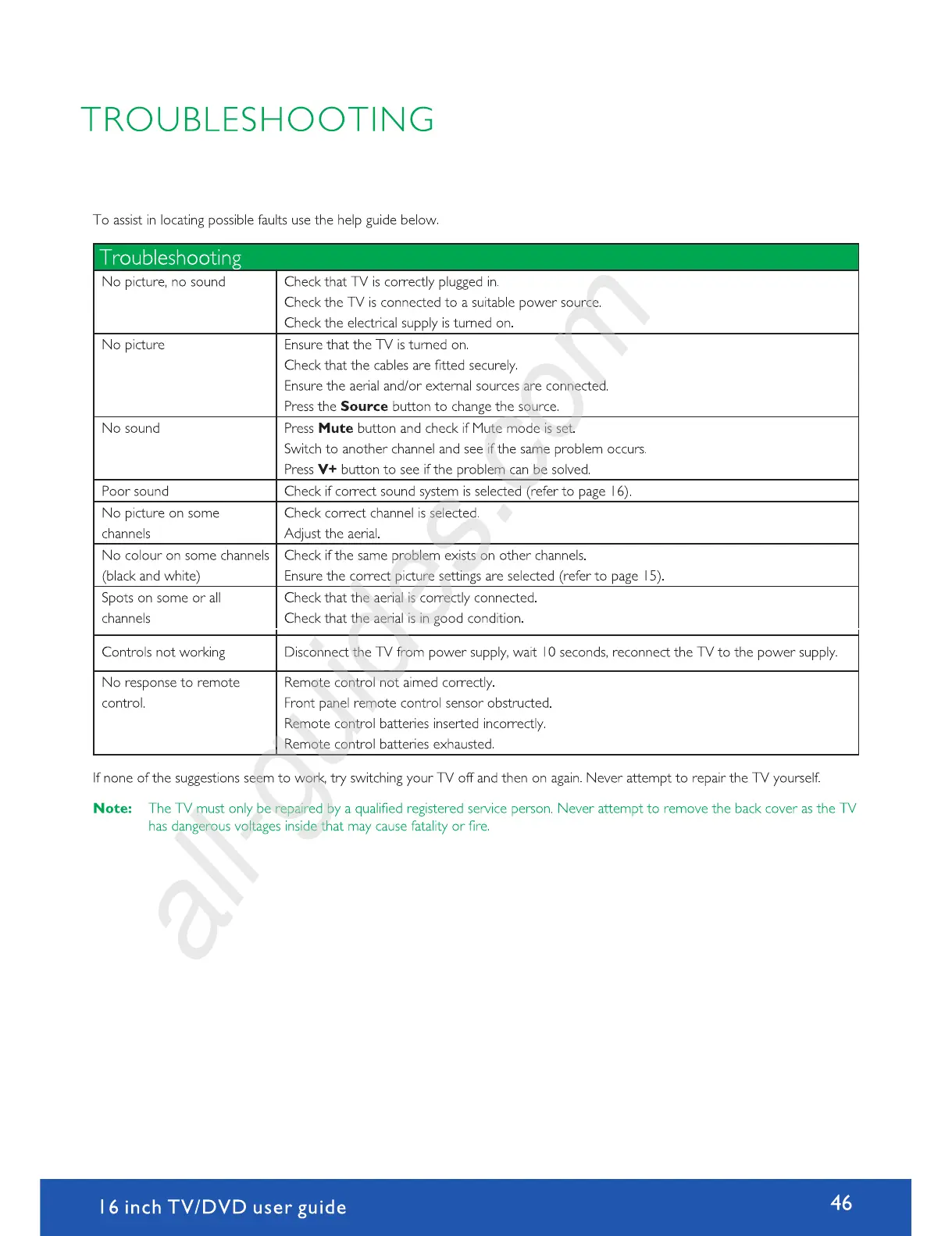 Avtex W164DRS - Troubleshooting Guide; Resolving Picture and Sound Issues; Remote Control and Channel Reception Fixes