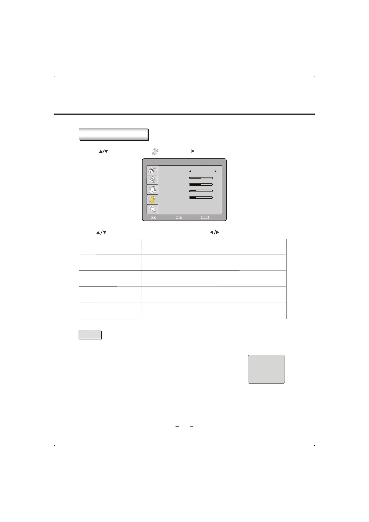 Press [ ] button to select different items and press [ ] button to adjust .
