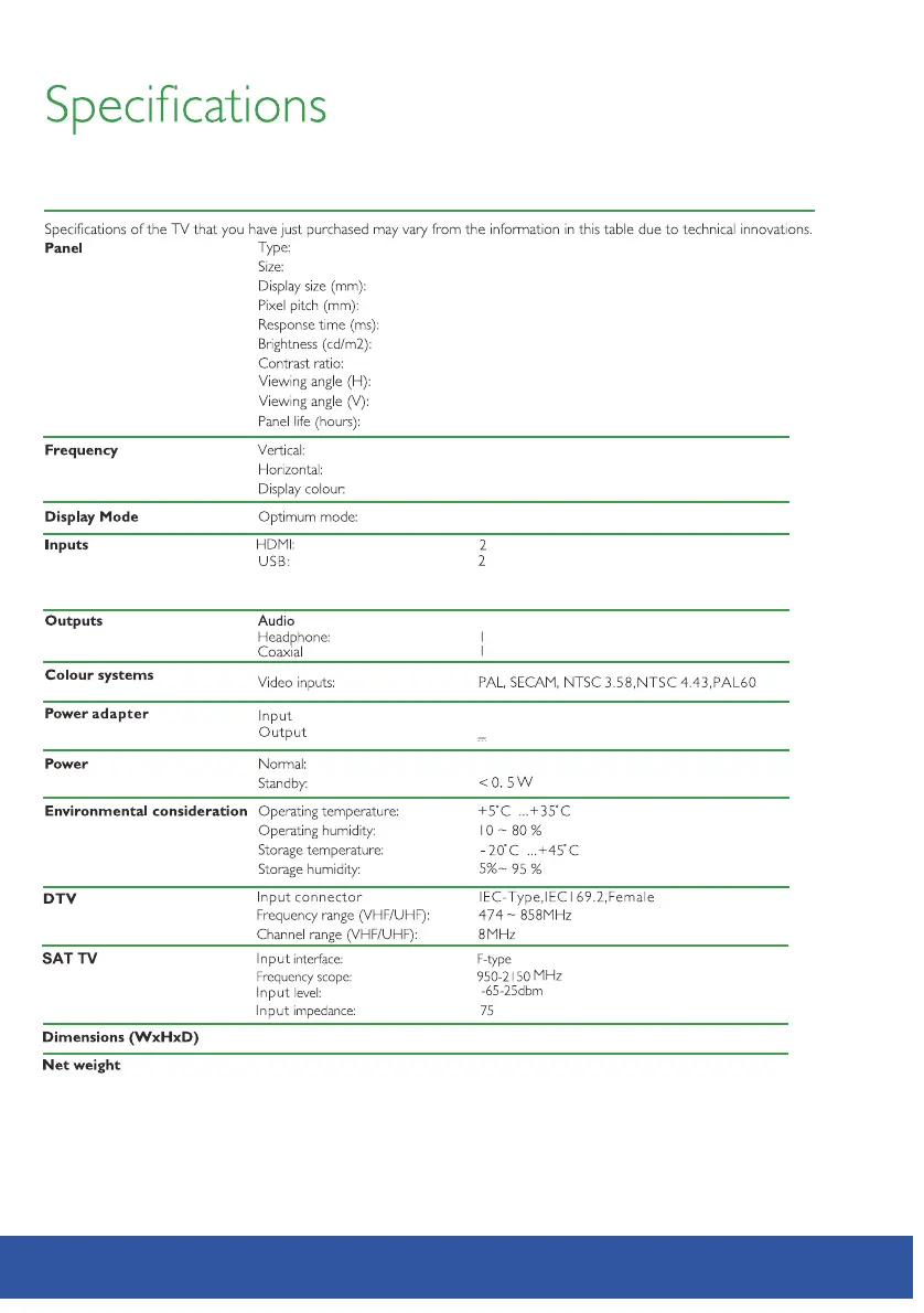 Avtex W279TS - Specifications (32-inch Model); Panel and Frequency Specifications; Input, Output, and Colour System Specs; Power, Environmental, and DTV;SAT TV Specs