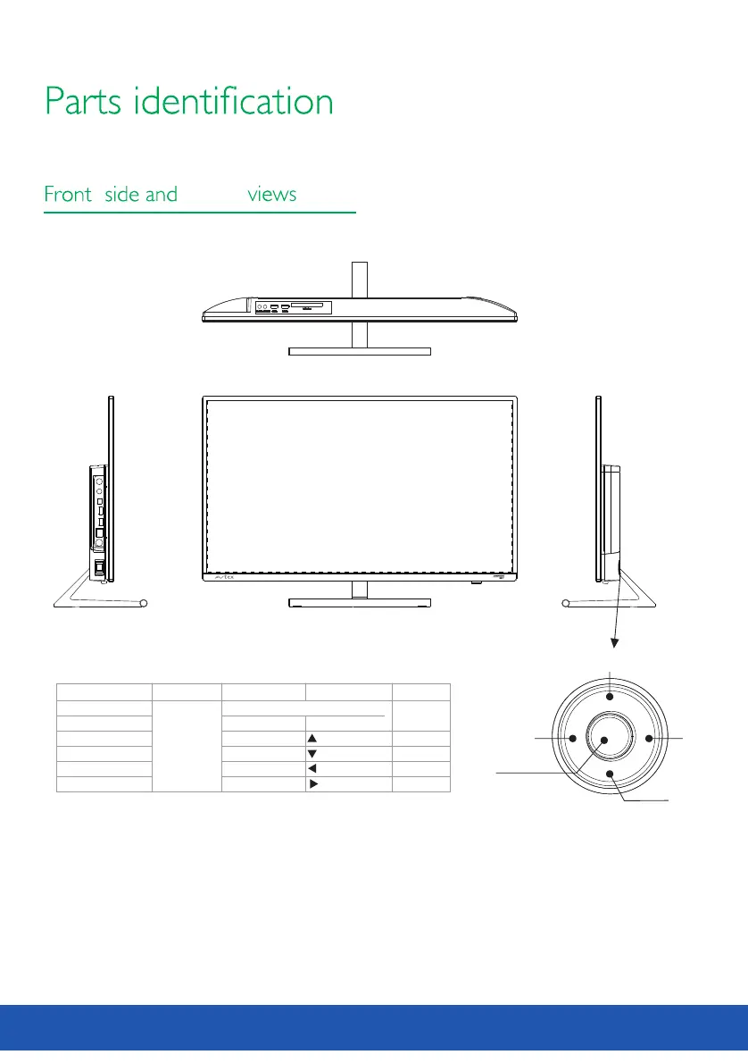 Avtex W279TS - Parts Identification: Front and Side Views; Front, Side, and Top Views; Local Control Buttons and Menu OSD