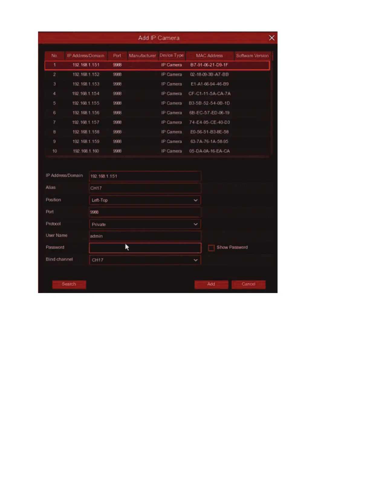 Password: Password of the IP camera