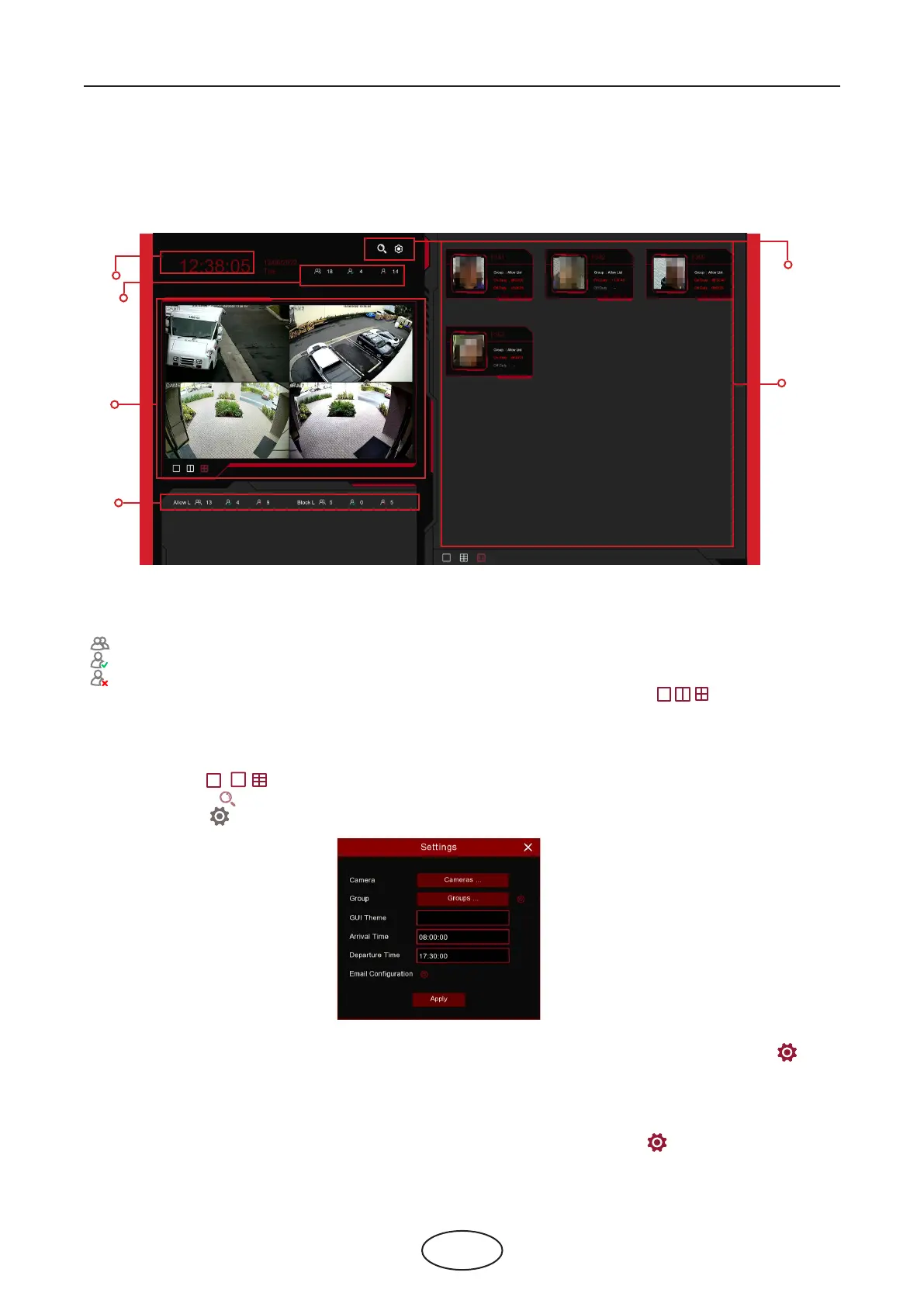 4. Live view screen: to display the live camera images. Click the screen split icons , , to change the