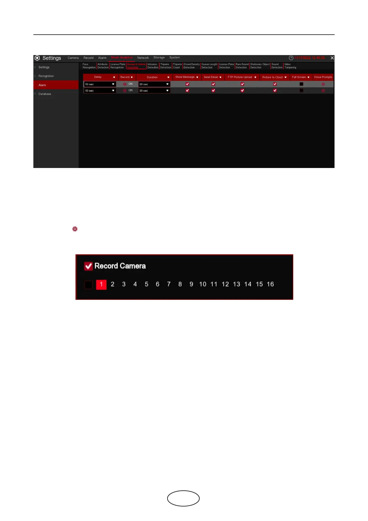 Record: Click icon to set channels that pedestrian and vehicle alarms.