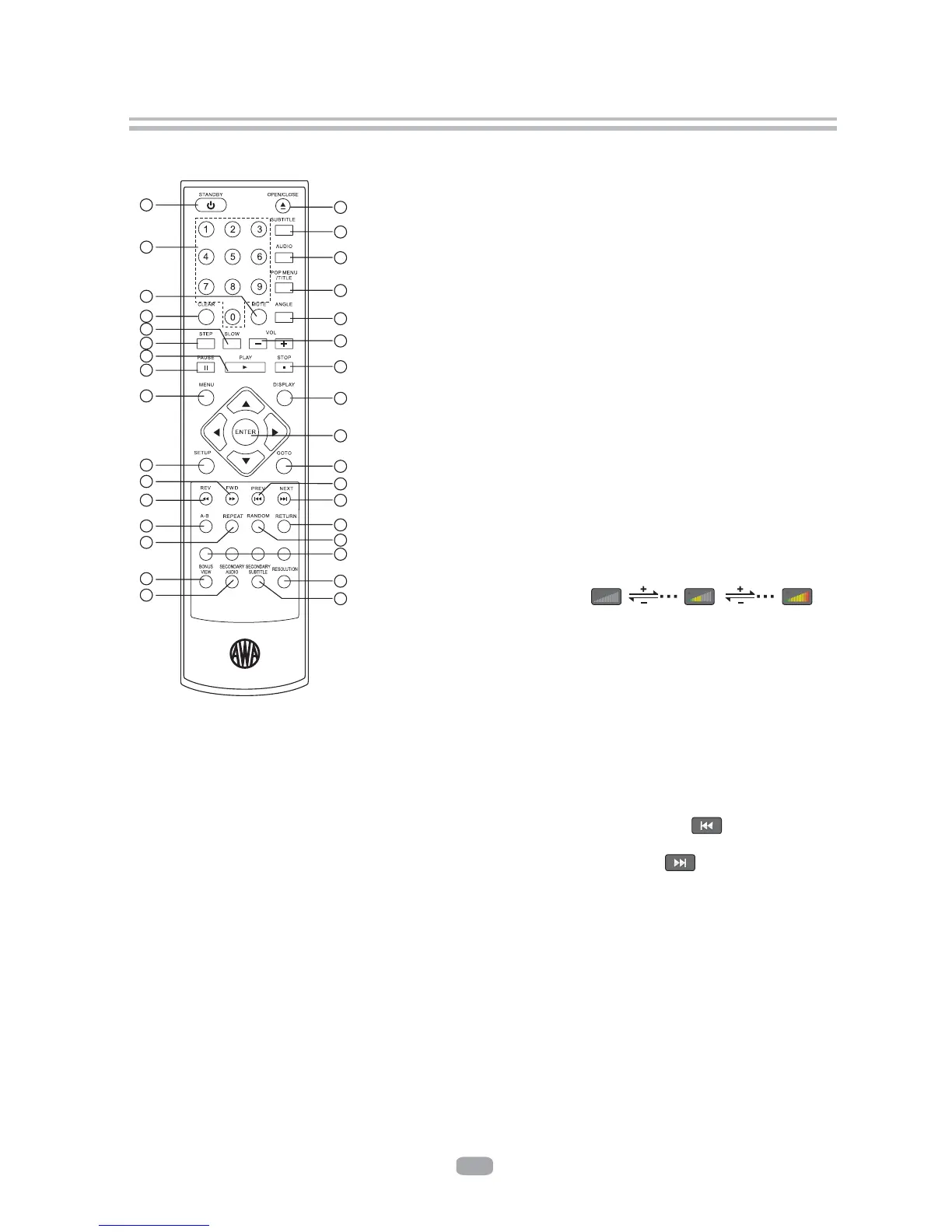 Press this button to play previous title, chapter, track or file if valid.