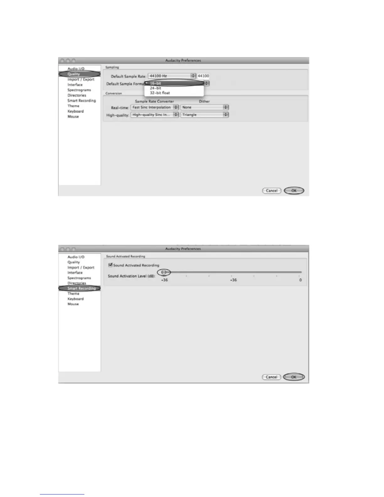 Under theQualitytab,settheDefaultSampleFormatto16 bit.SelectOKto