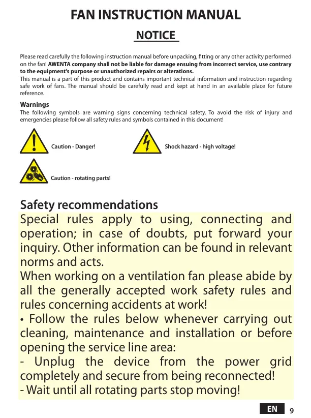 on the fan! AWENTA company shall not be liable for damage ensuing from incorrect service, use contrary