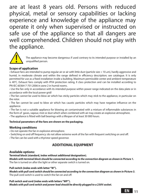 is 40°C. Exhaust fans comply with IPX4 protection rating, II class protection and can be installed according to
