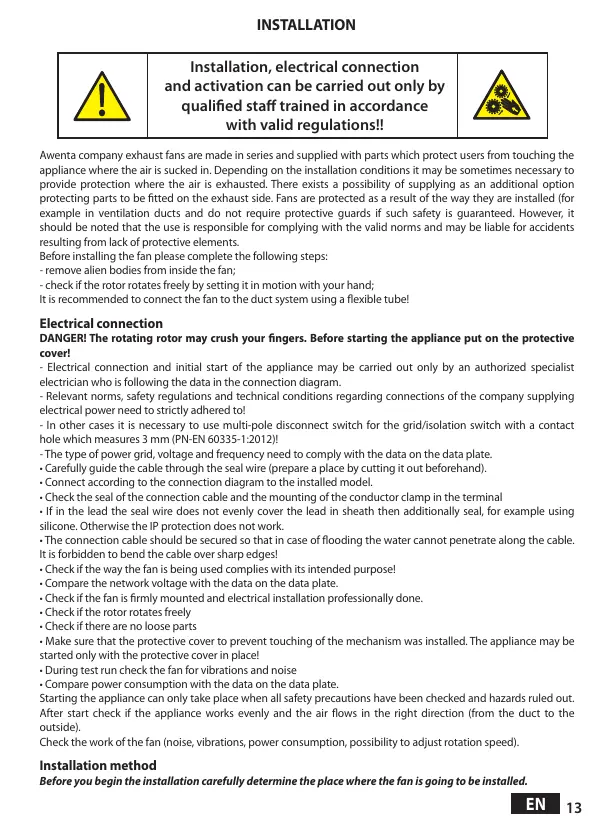Awenta company exhaust fans are made in series and supplied with parts which protect users from touching the