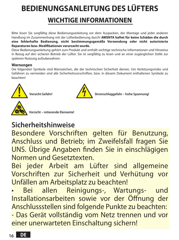 Handlung im Zusammenhang mit der Lüfterbedienung durch! AWENTA haftet für keine Schäden die durch