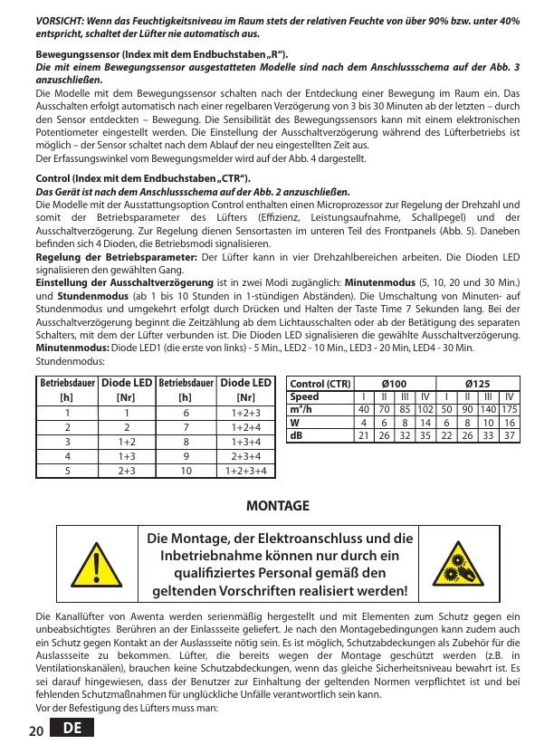 Regelung der Betriebsparameter: Der Lüfter kann in vier Drehzahlbereichen arbeiten. Die Dioden LED