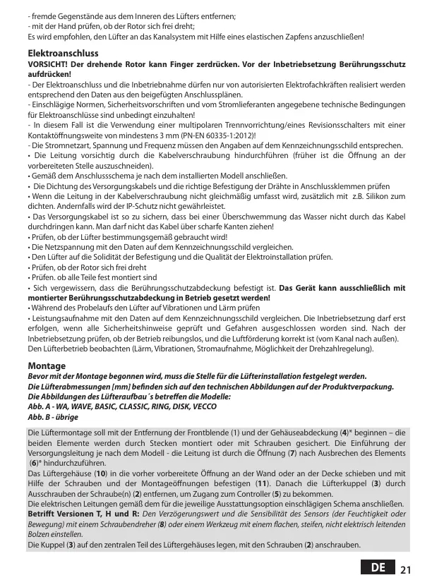 • Den Lüfter auf die Solidität der Befestigung und die Qualität der Elektroinstallation prüfen.