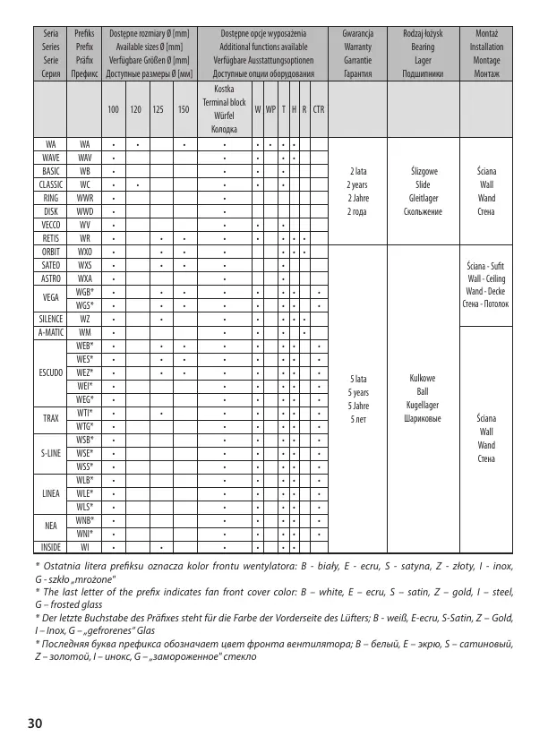 * The last letter of the prex indicates fan front cover color: B – white, E – ecru, S – satin, Z – gold, I – steel,