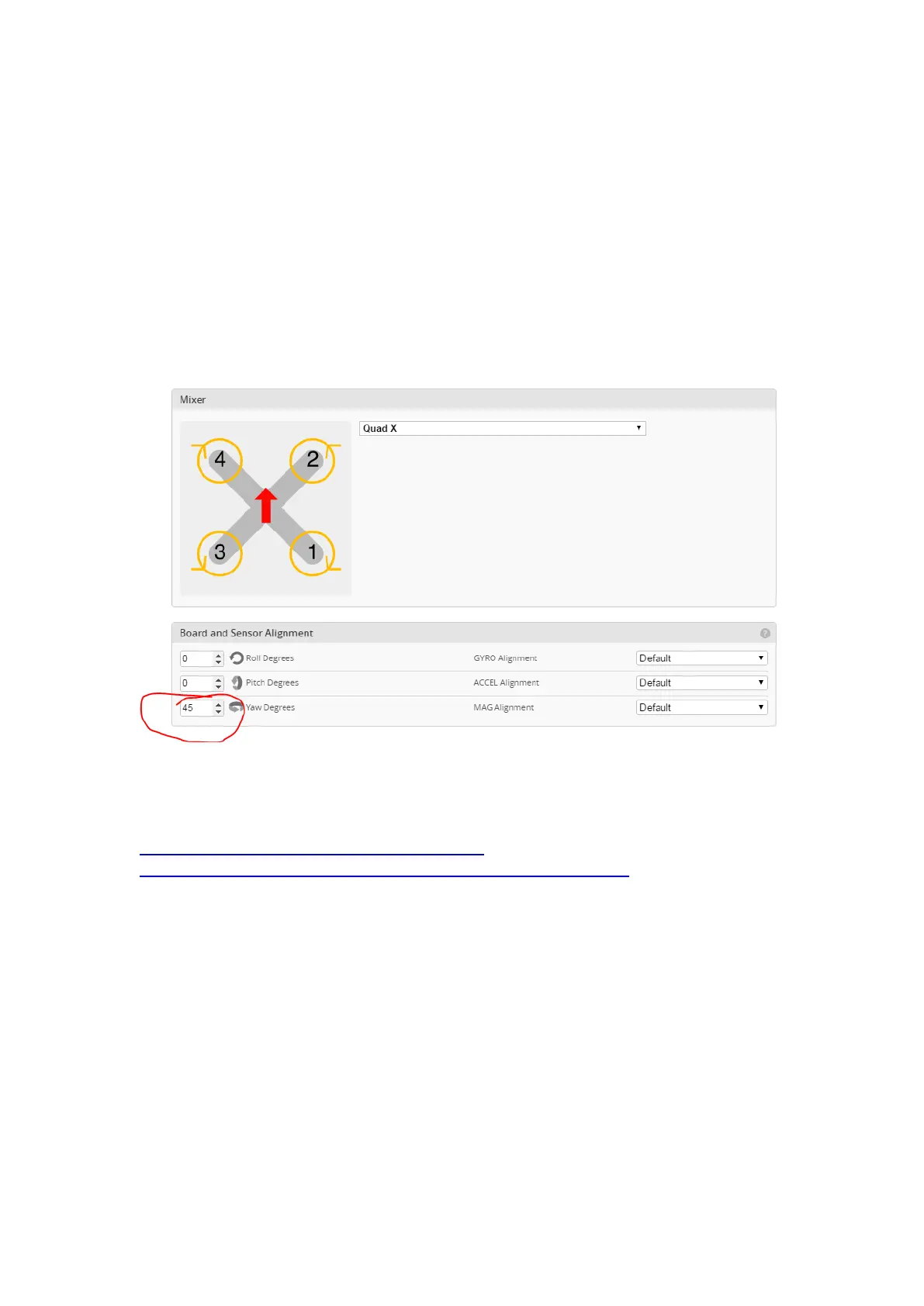 being mounted 45 degrees in yaw. This is achieved using the Cleanflight or