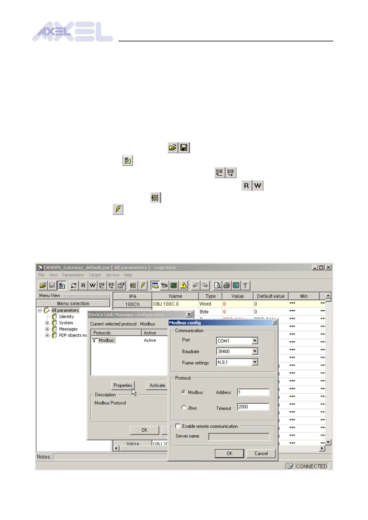 • The toolbar with the functions for exchanging parameters