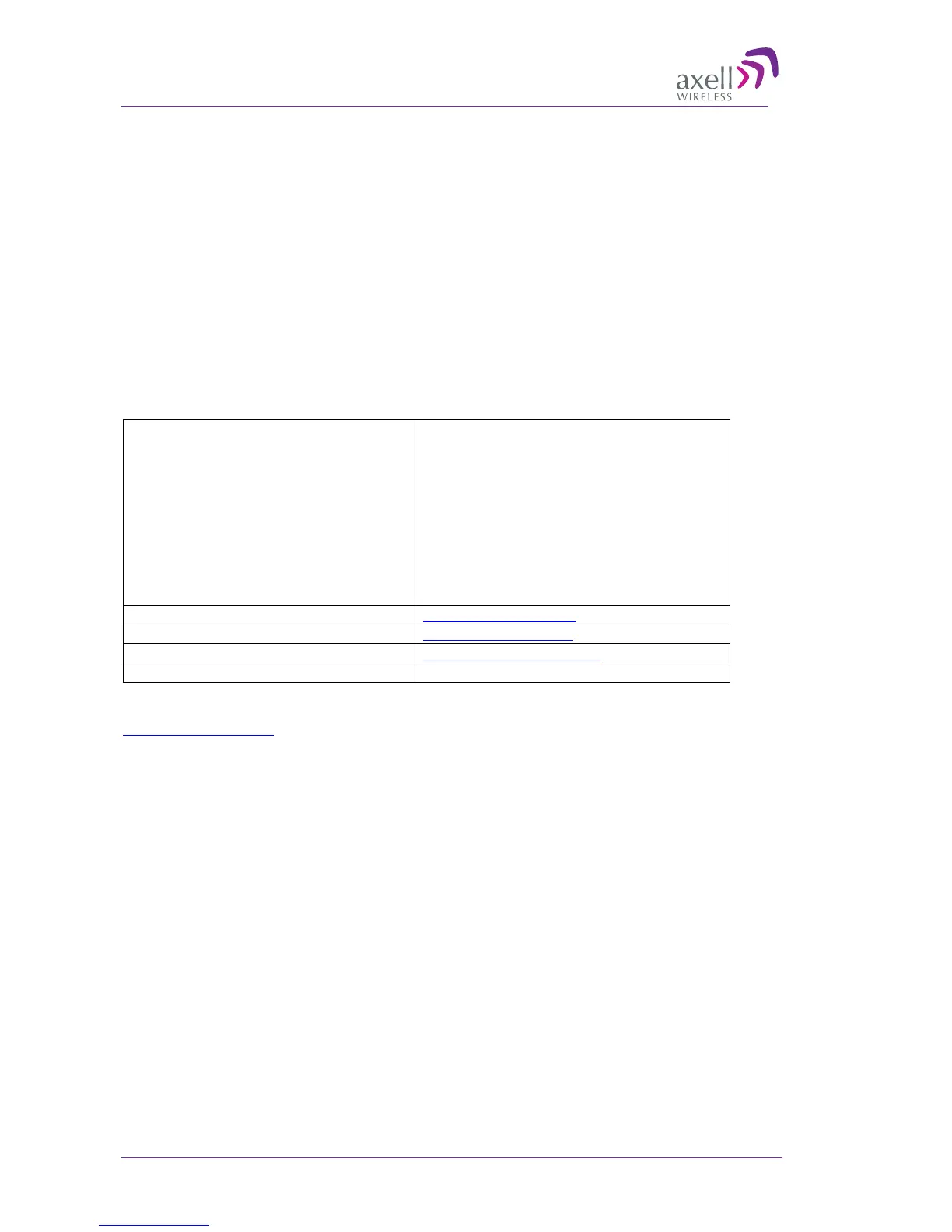 Contact information for Axell Wireless offices in other countries can be found on our web site,