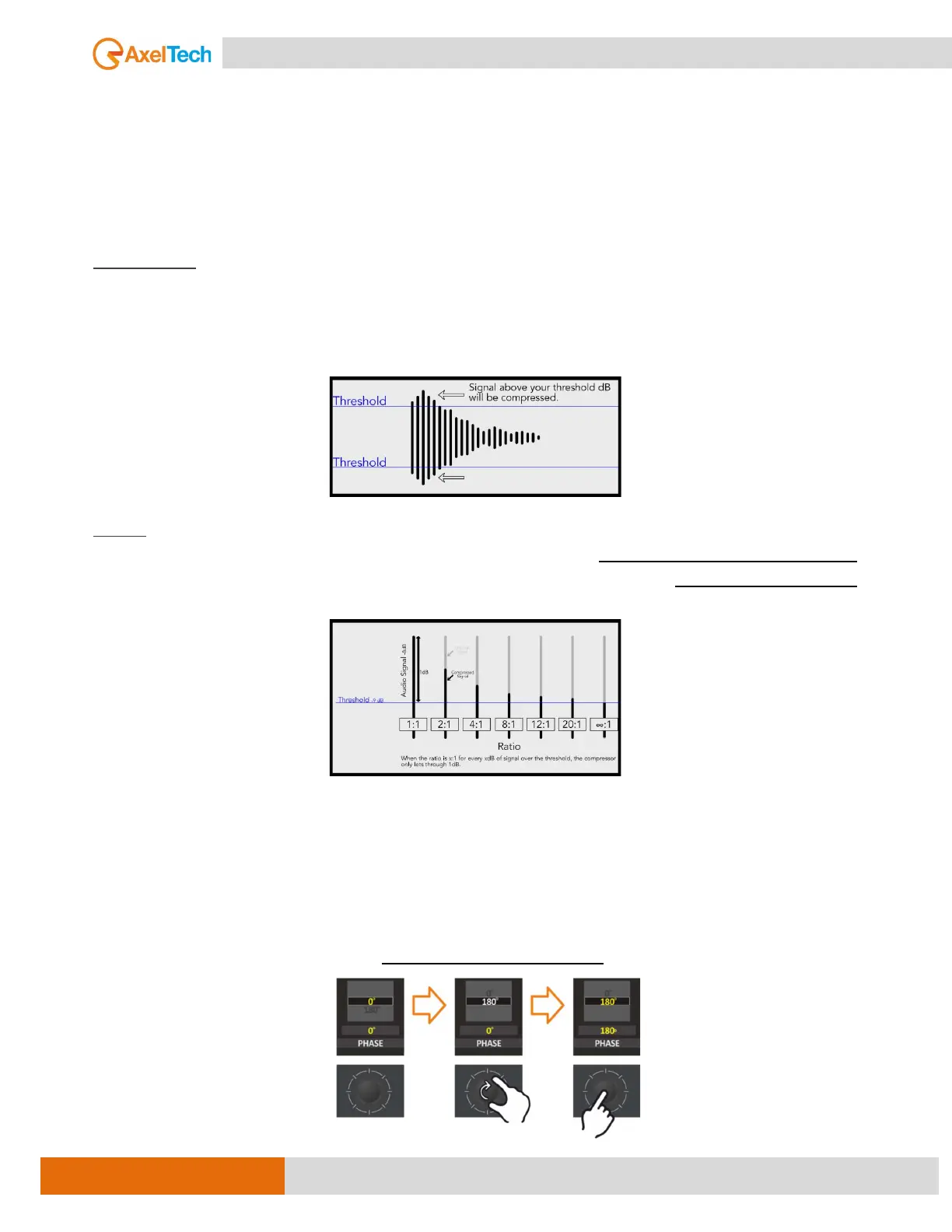A compressor reduces the level of an audio signal if its amplitude exceeds a certain threshold. The threshold
