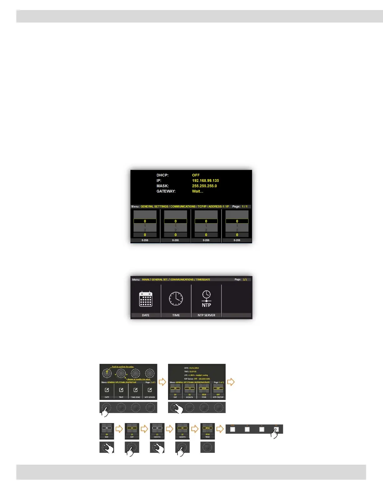 From the GENERAL SET part of the menu, you can set the communication parameters like IP, DNS, Date &