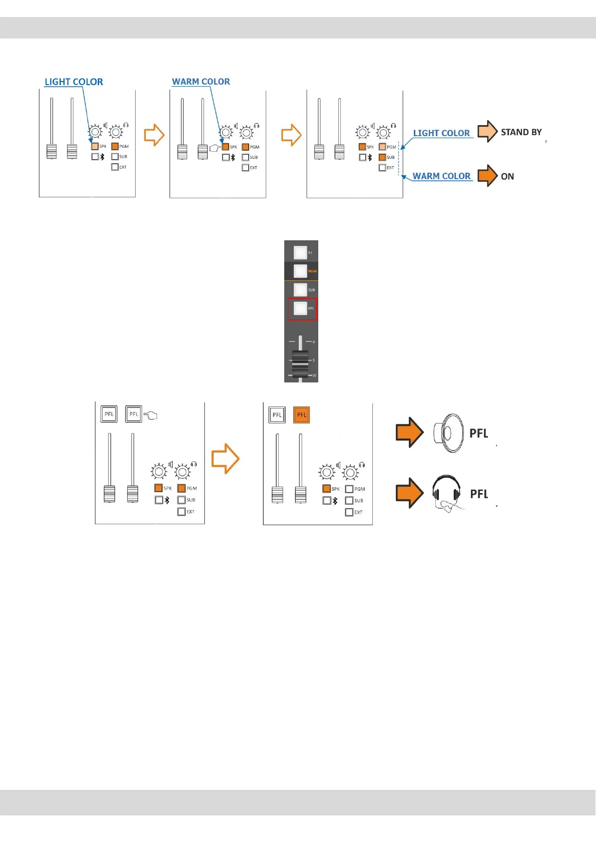 2SEL+PFL: This mode allows you to listen to ONE selected output (PGM, SUB, EXT) in SPK-CRM, and by