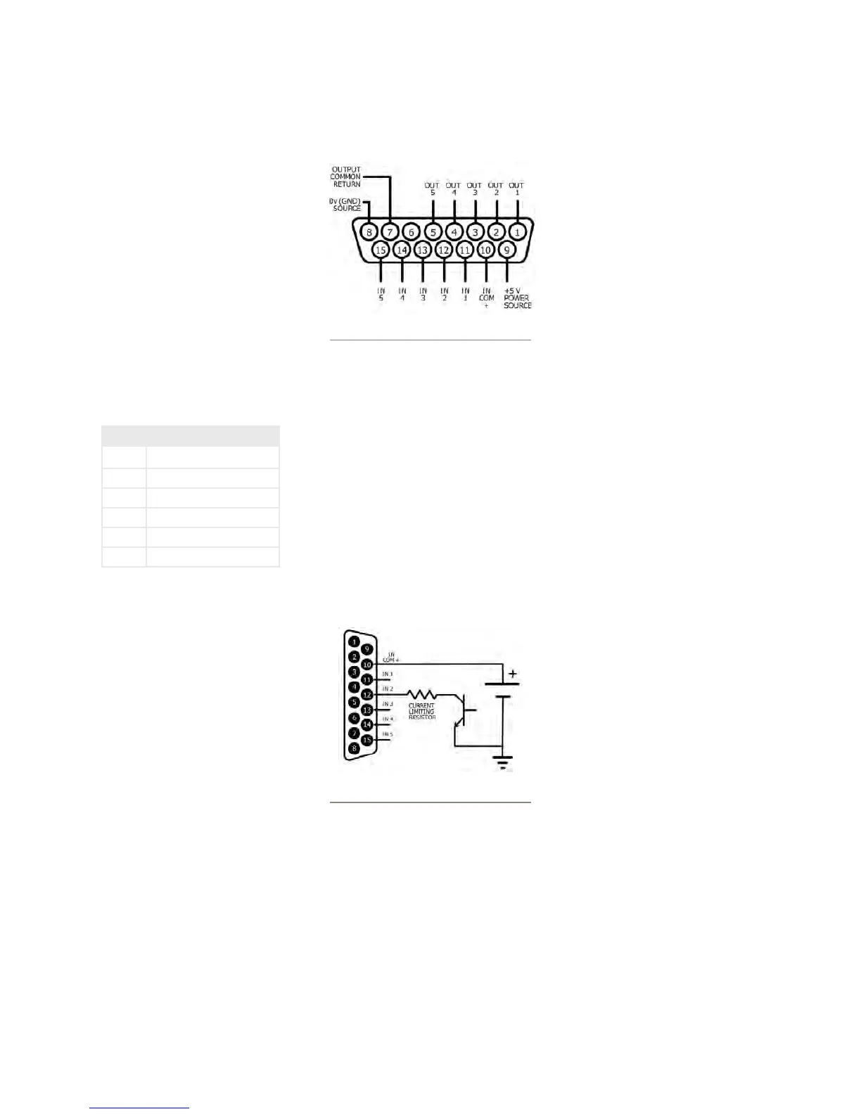 The illustration shows the connector pinouts; 5 inputs and associated common return, 5 output relays and associated com-