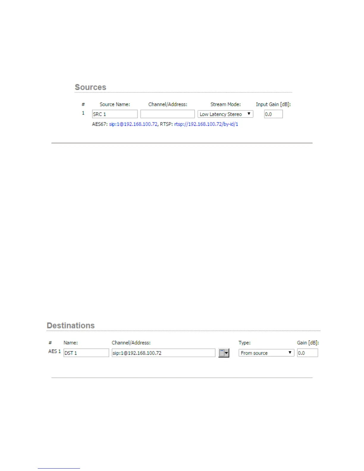 In order to setup AES67 Unicast stream receive, enter the SIP URI stream address in Channel/Address eld of a