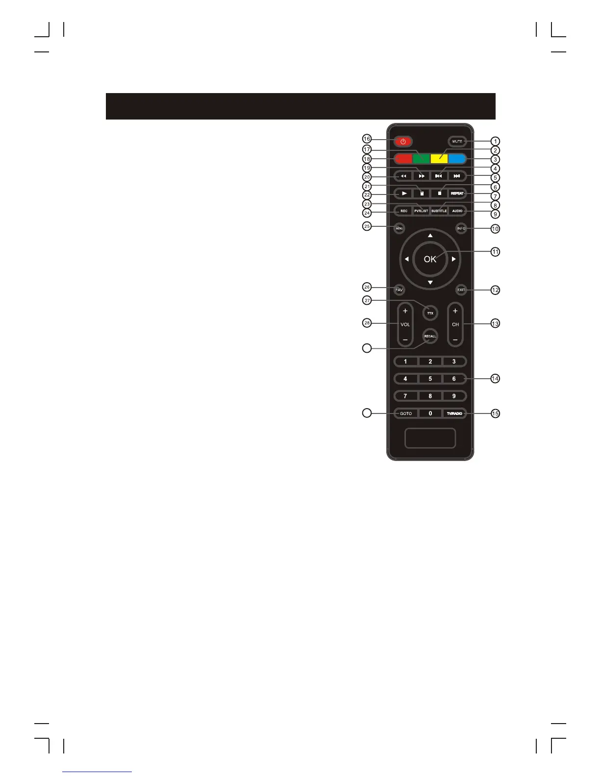 25. MENU: Turns on Main Menu.