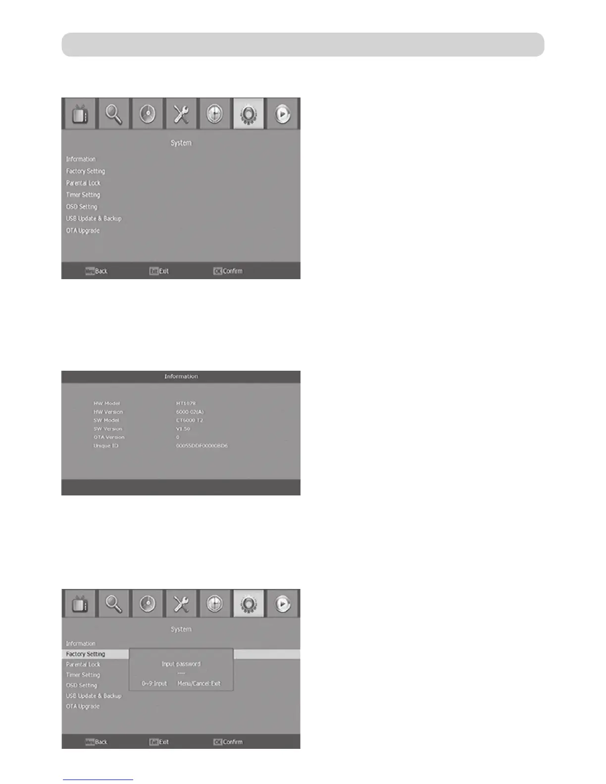 Prikazuje se sučelje s raznim informacijama o prijemniku. Informacije o sklopovlju