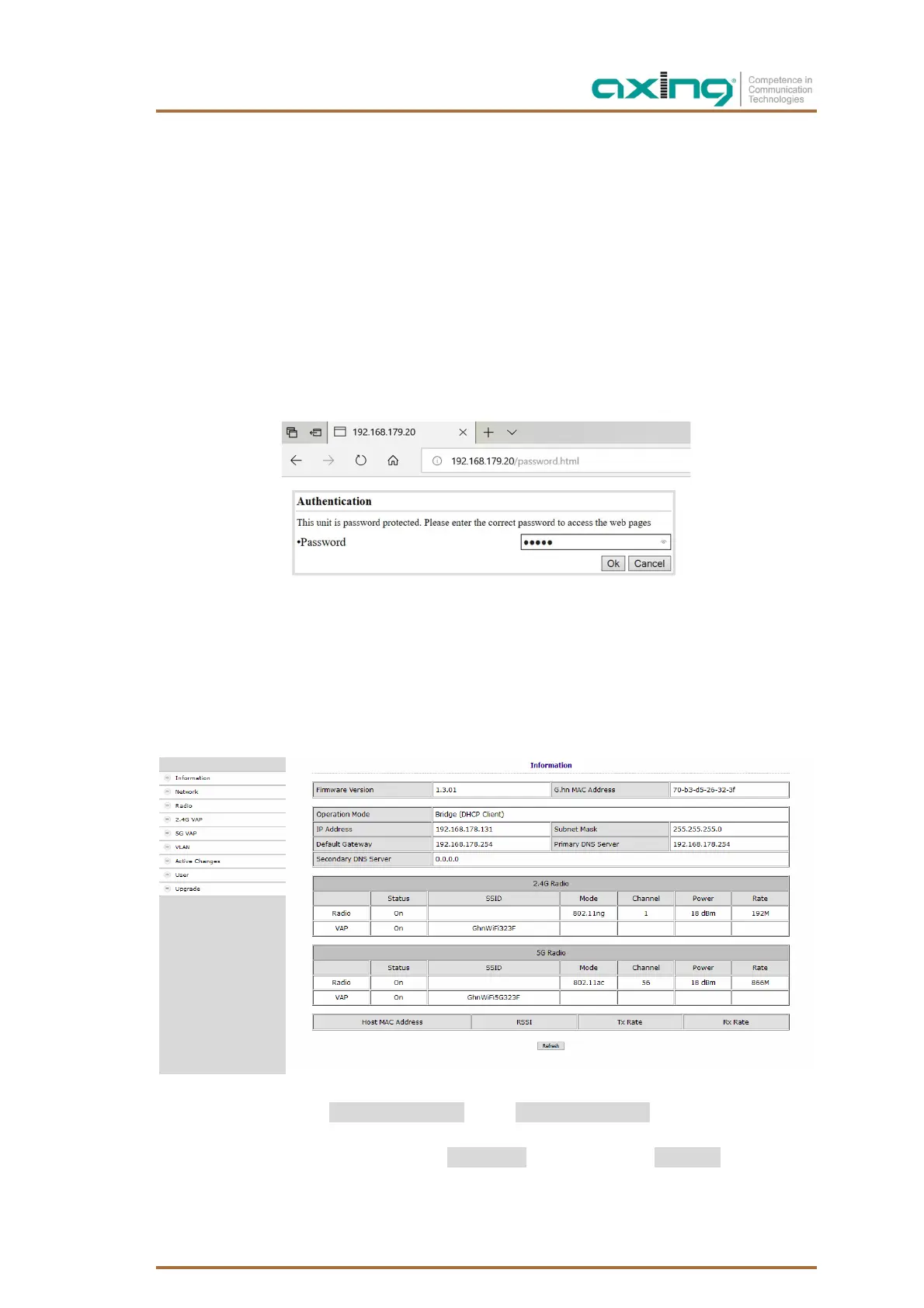Seite 11), sowie die vom DHCP-Server bezogenen oder manuell eingestellten IP-Adressdaten. Darunter sind die