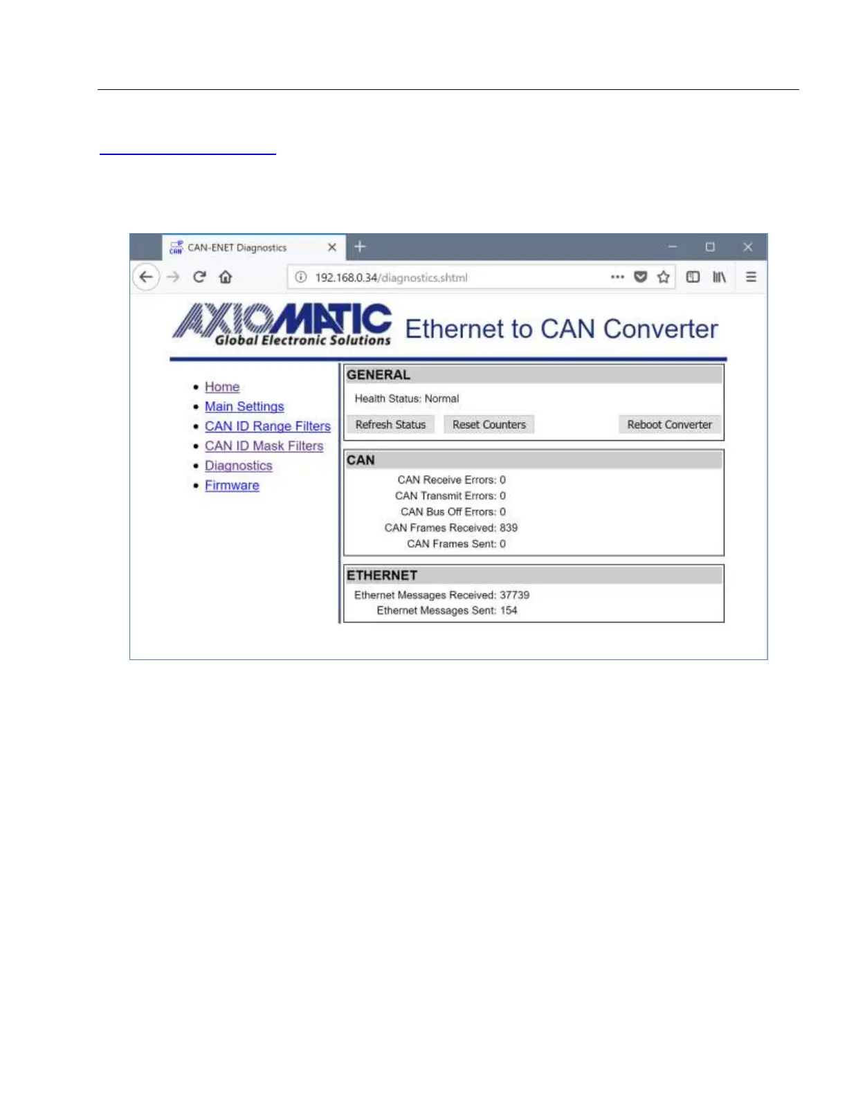 The Diagnostics page shows the Health Status of the converter together with the CAN and