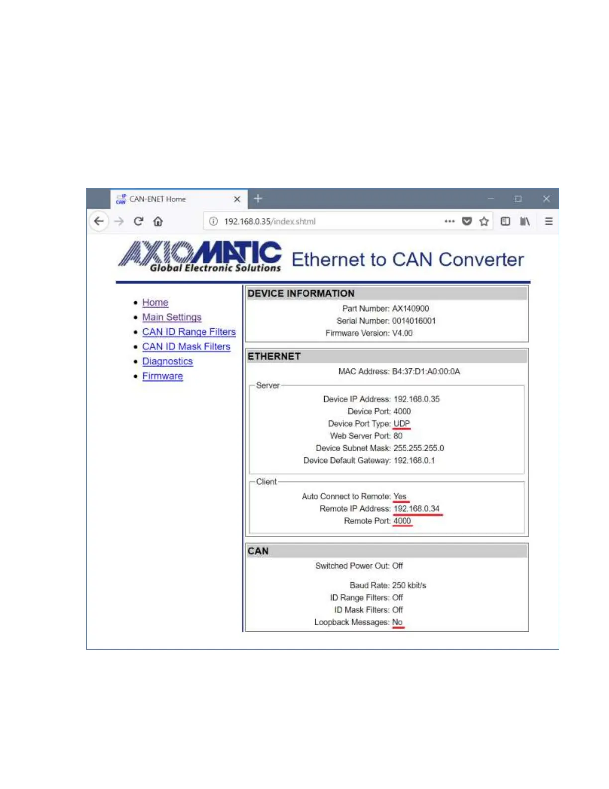 The CAN network setup is done similarly to the server mode; the Baud Rate is set to the