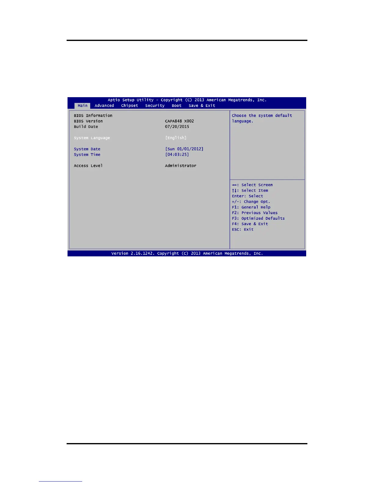 described below. The Main BIOS setup screen is shown below.