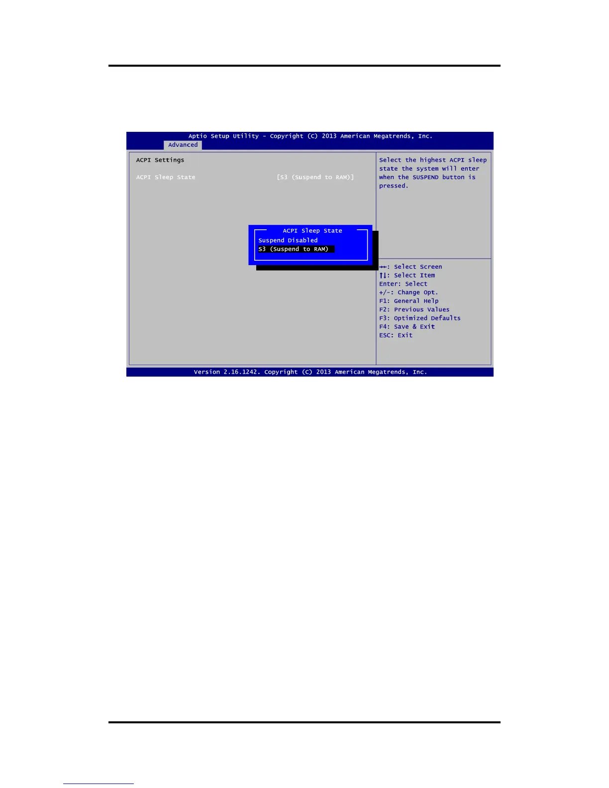 options are Suspend Disabled and S3 (Suspend to RAM). The default setting is S3