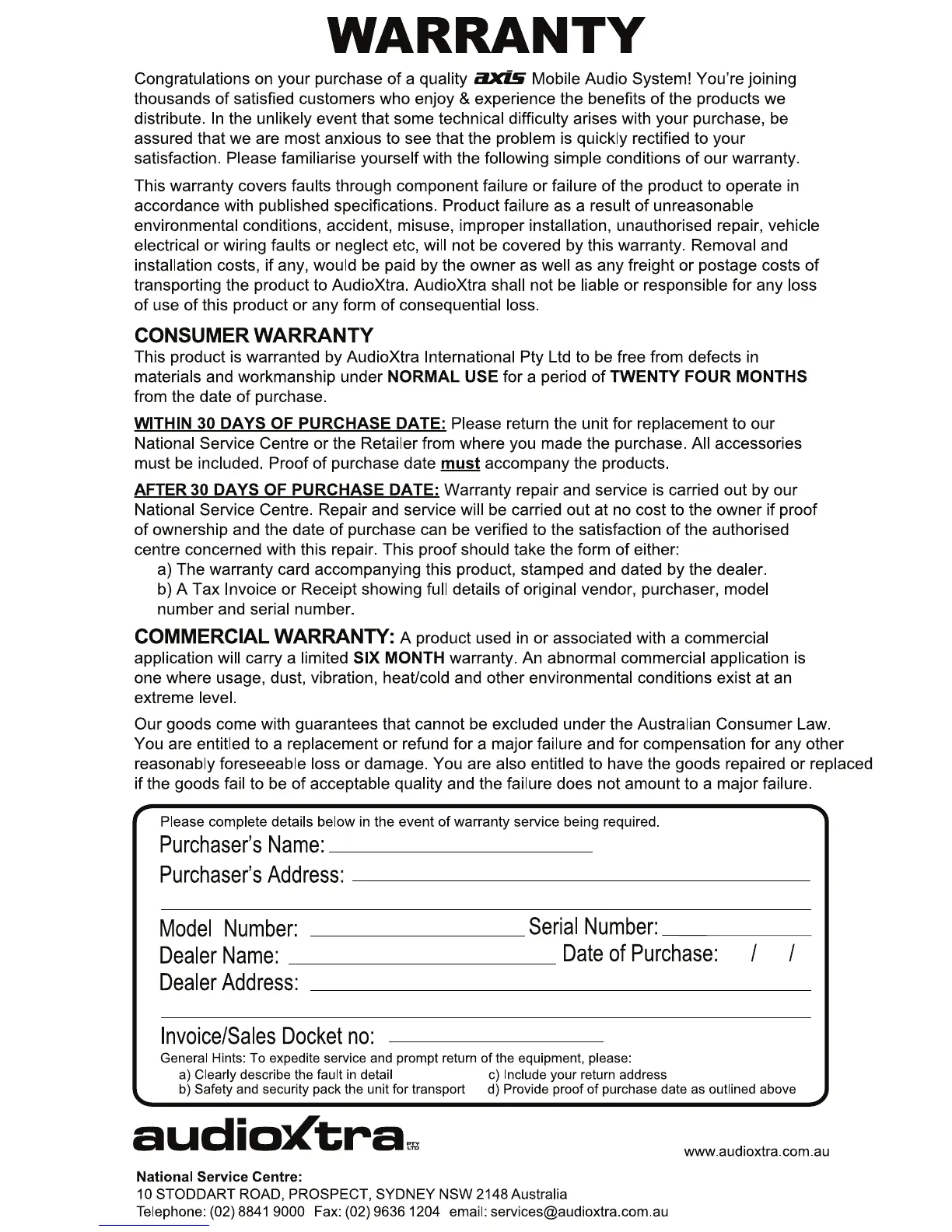 Axis Car Audio AX1803BT - WARRANTY INFORMATION; Warranty Coverage and Conditions; Proof of Purchase Requirements; Commercial Application Warranty