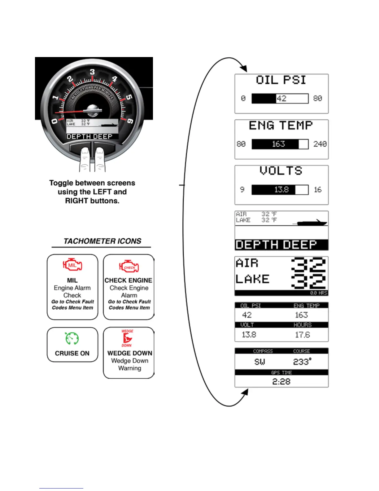 informaon.Thetoggleswitchislocatedonthetachometer.SomeinformaonsuchasthedepthandGPS