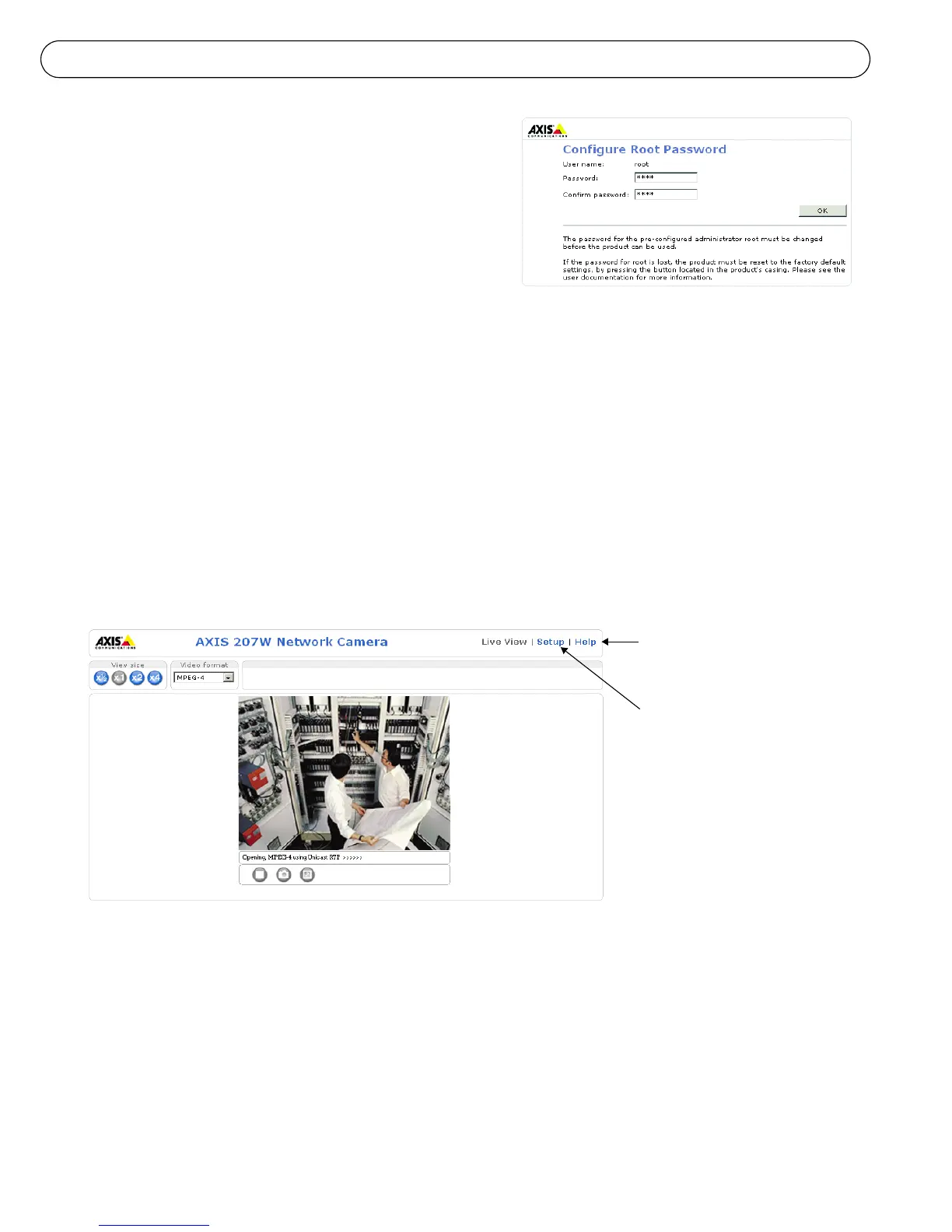 6. The Live View page of the AXIS 207/207W is displayed, complete with links to the Setup