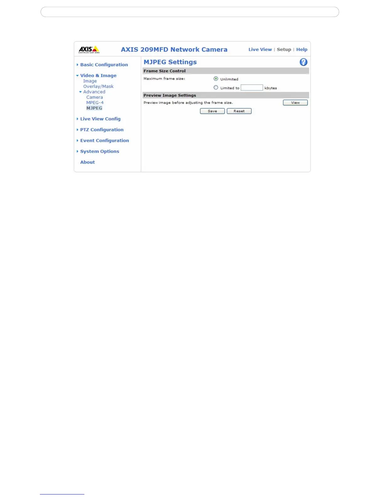 The MJPEG Settings window is used to control the frame size of the video stream in order to improve either