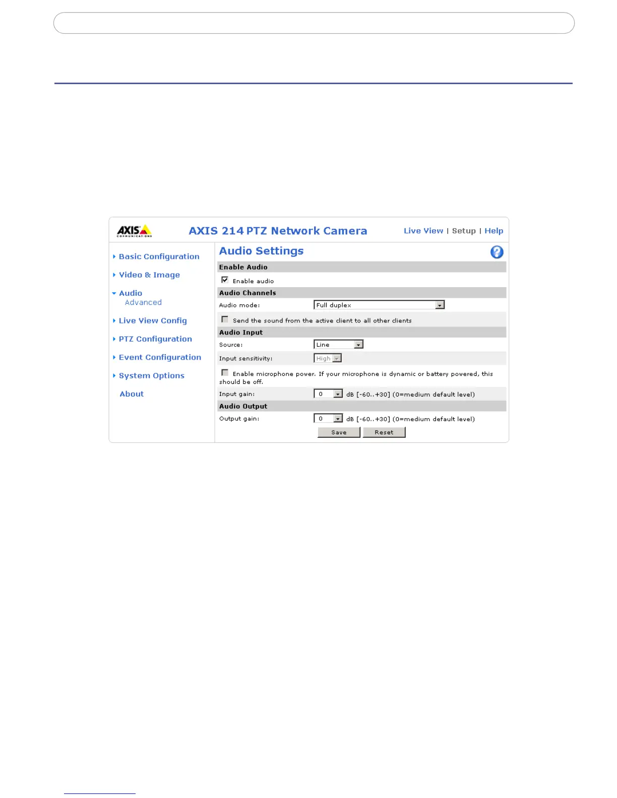 This section describes how to configure the basic audio settings for the AXIS 214 PTZ, e.g.