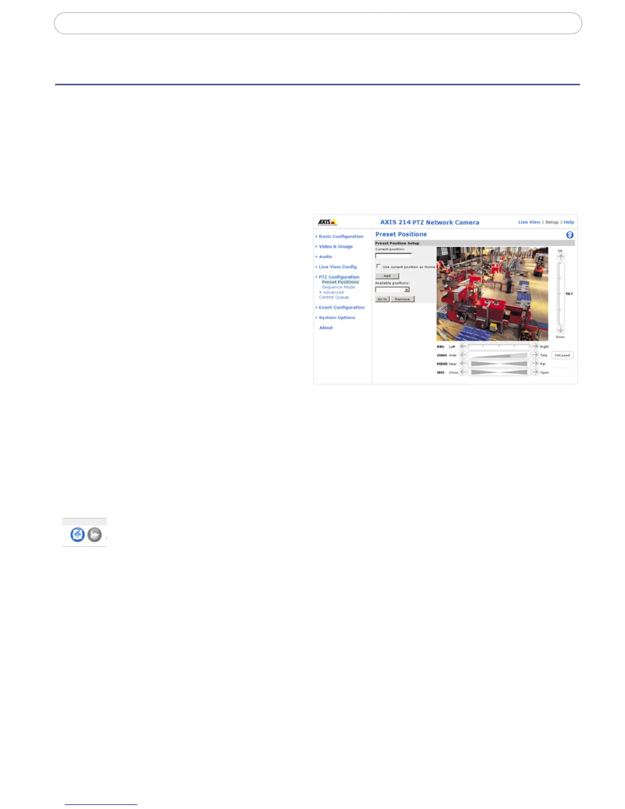 From Preset Position Setup, use the Pan, Tilt and Zoom (PTZ) controls to steer the camera