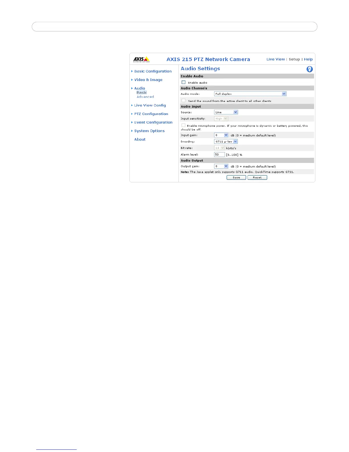 will play audio, but no audio will be transmitted from the AXIS 215 PTZ to other web clients. This could be