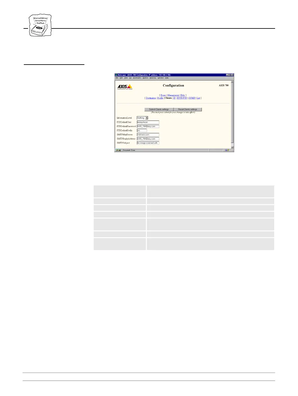 SMTPReplyAddress The reply address for e-mails sent by the AXIS 700.