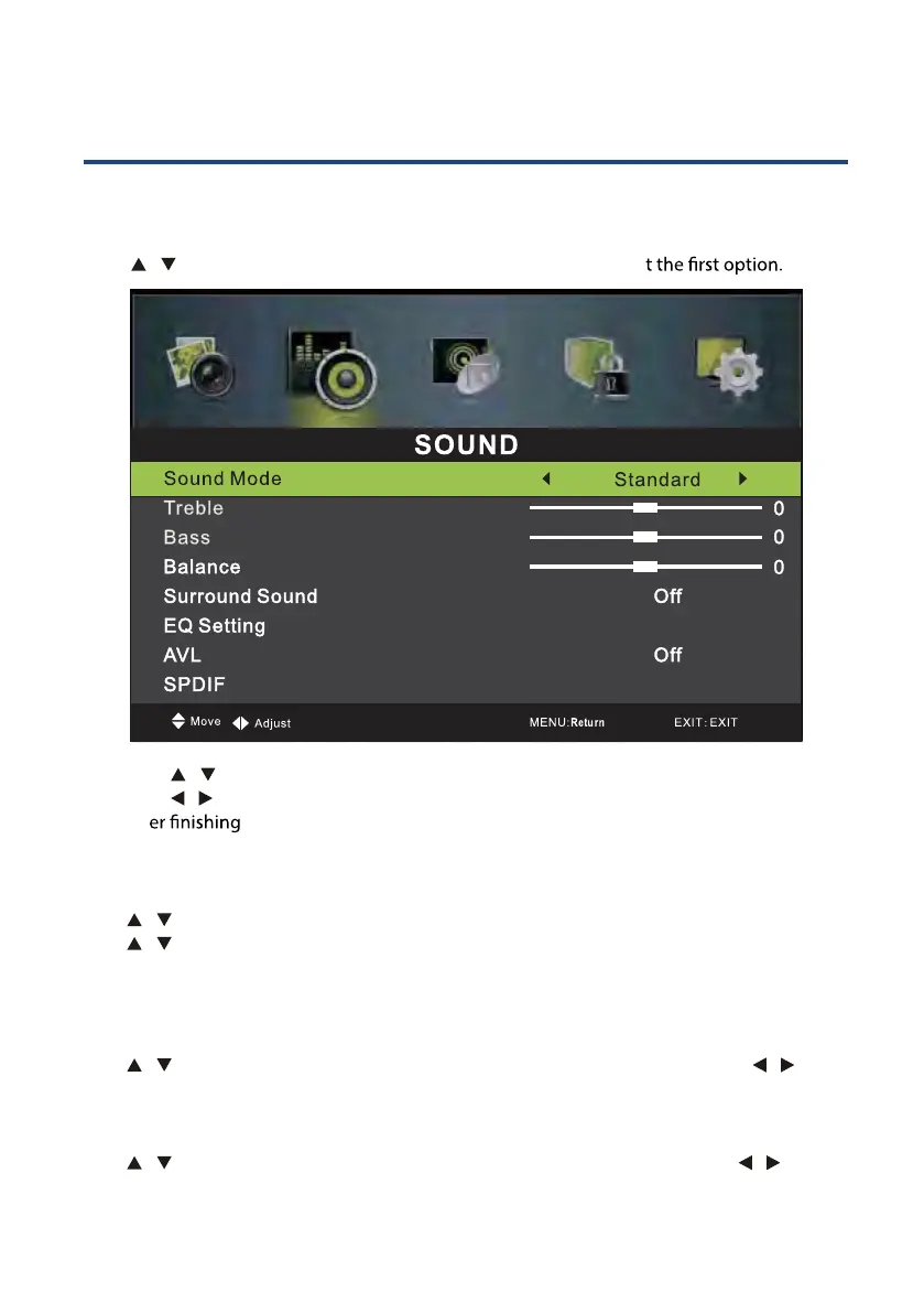 1. Press / button to select the option that you want to adjust in the SOUND menu.