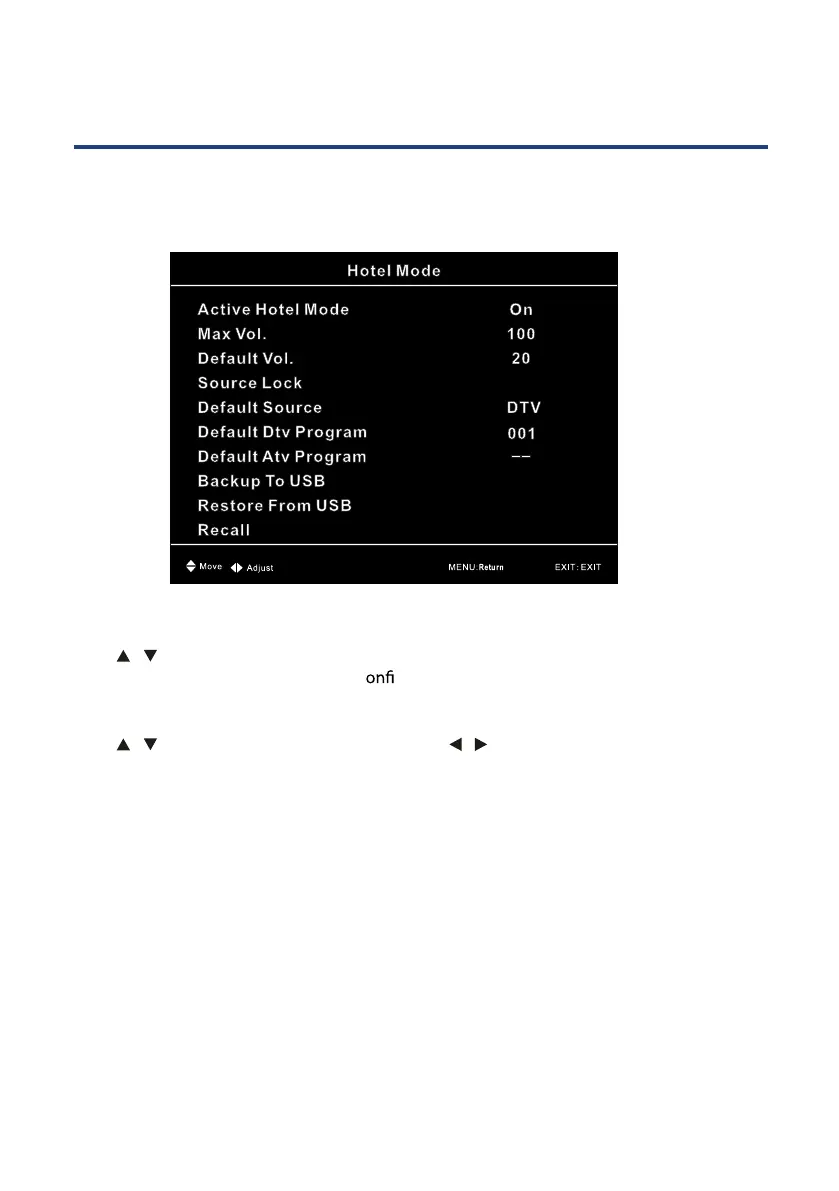 Press MENU + 1229 to enter the Hotel Mode Menu,this menu allows you to adjust the setting