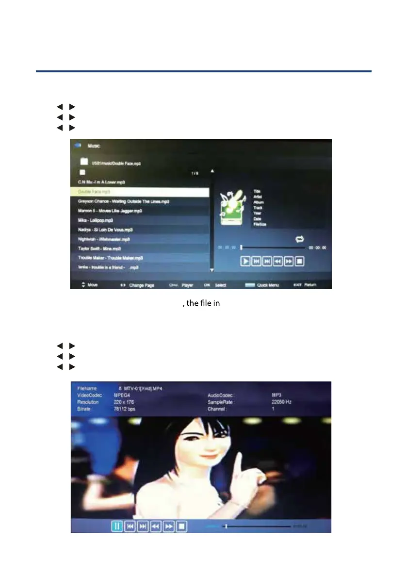 Press / button to select MUSIC in the main menu, then press OK button to enter.