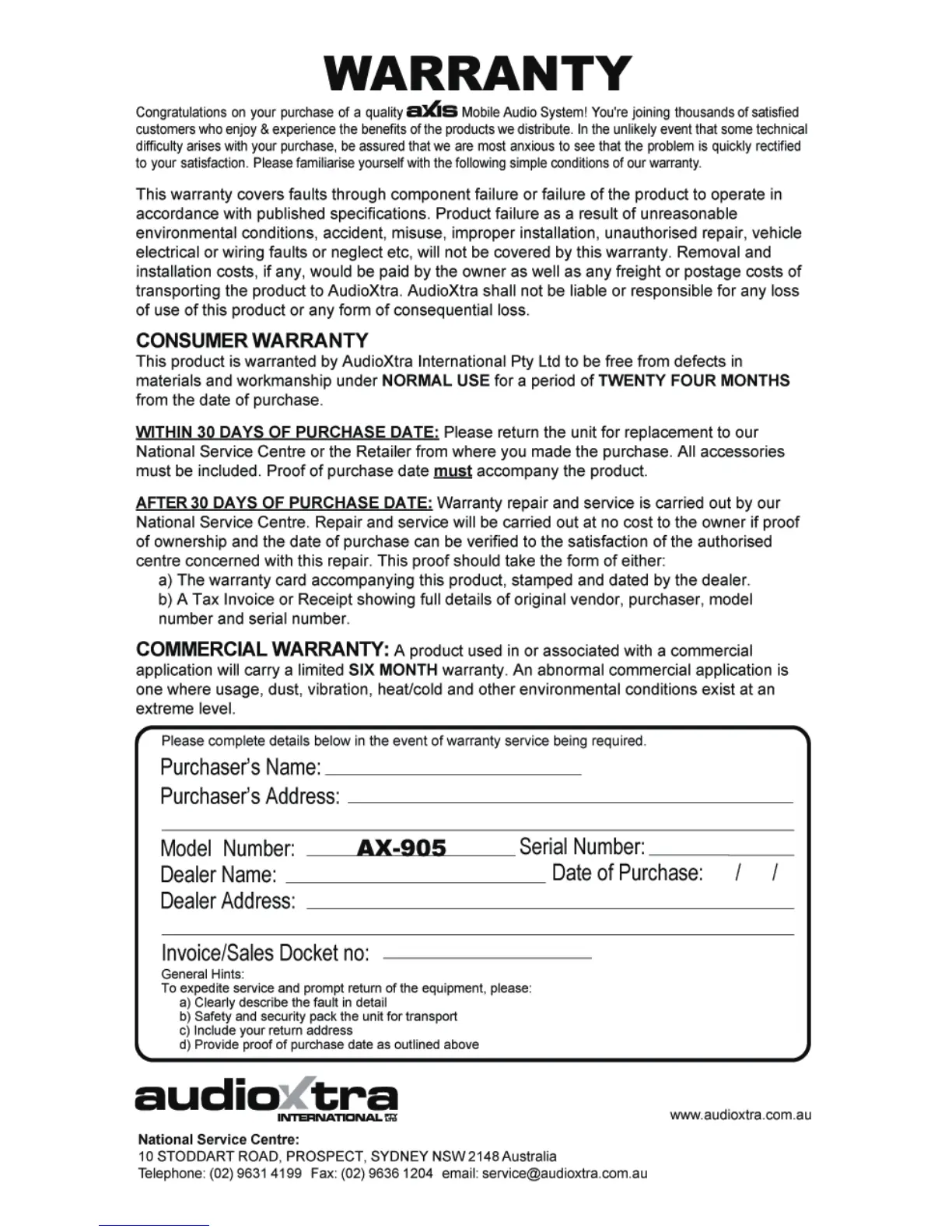 Axis AX-905 - Warranty Information and Service; Warranty Coverage Terms; Warranty Claim Procedure