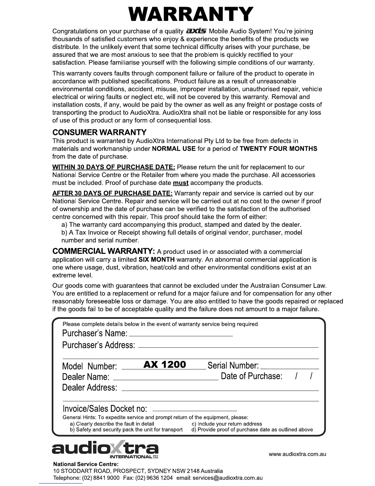 Axis AX1200 - Warranty Information and Service; Warranty Terms and Coverage; Warranty Service and Purchaser Details