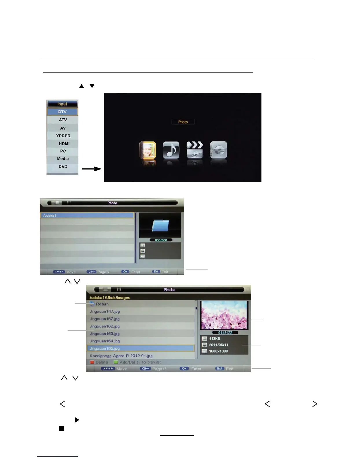 Press button to previous menu, Press EXIT button to select the file view type: list( ) or thumbnails( ).